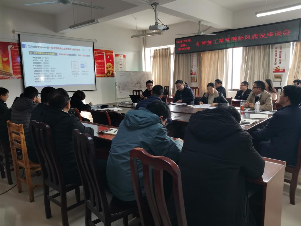 本网讯 为了提升矿物加工工程专业学科建设,12月5日,我院在黄金校区逸夫楼A705会议室召开矿物加工工程专业建设座谈会,推进本科教育教学审核评估、国家一流本科专业建设、工程教育认证工作。资源与环境工程学院党委书记陈明、院长何桂春、副院长陈飞和矿物加工工程专业全体教师参加了座谈会。会议由矿物加工工程系主任严华山主持。