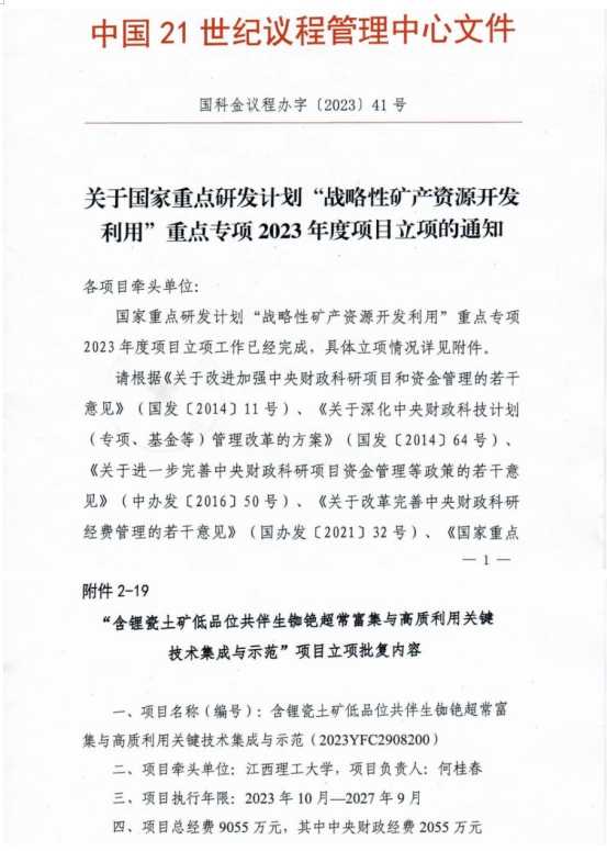 本网讯 近日,从中国21世纪议程管理中心获悉,由我院何桂春教授牵头申报的“十四五”国家重点研发计划“战略矿产资源开发利用”重点专项“含锂瓷土矿低品位共伴生铷铯超常富集与高质利用关键技术集成与示范”项目(编号:2023YFC2908200)获得正式立项,获批中央财政资金2055万元。