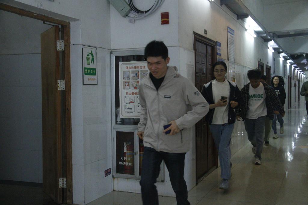 演练时,所有参加人员在办公、上课、学习、实验一切如常。随着警报响起,各楼层指挥员立即跑至每个房间并指挥全体人员迅速有序的离开房间。在有序指挥下,老师和同学们纷纷迅速弯腰、靠墙、捂住口鼻,严格按照正确的逃生姿势从东面楼梯靠右有序下楼到一楼空地处集合,到达安全地区。随后各指挥员在逸夫楼1楼东面安全出口外的排球场清点人数。
