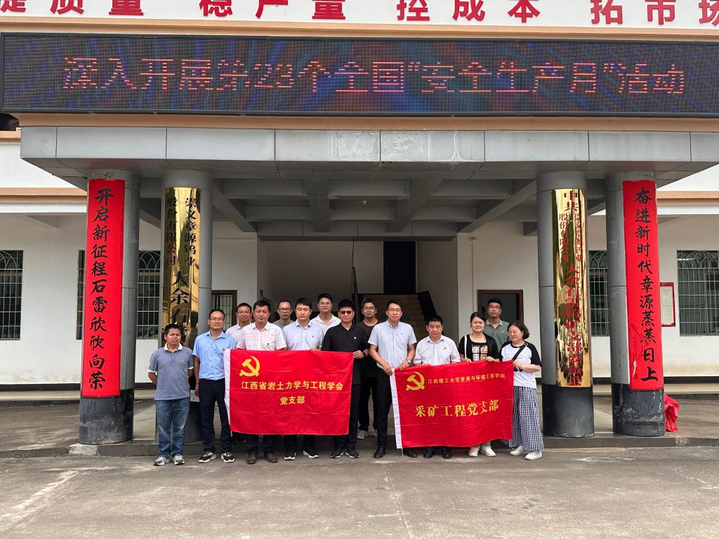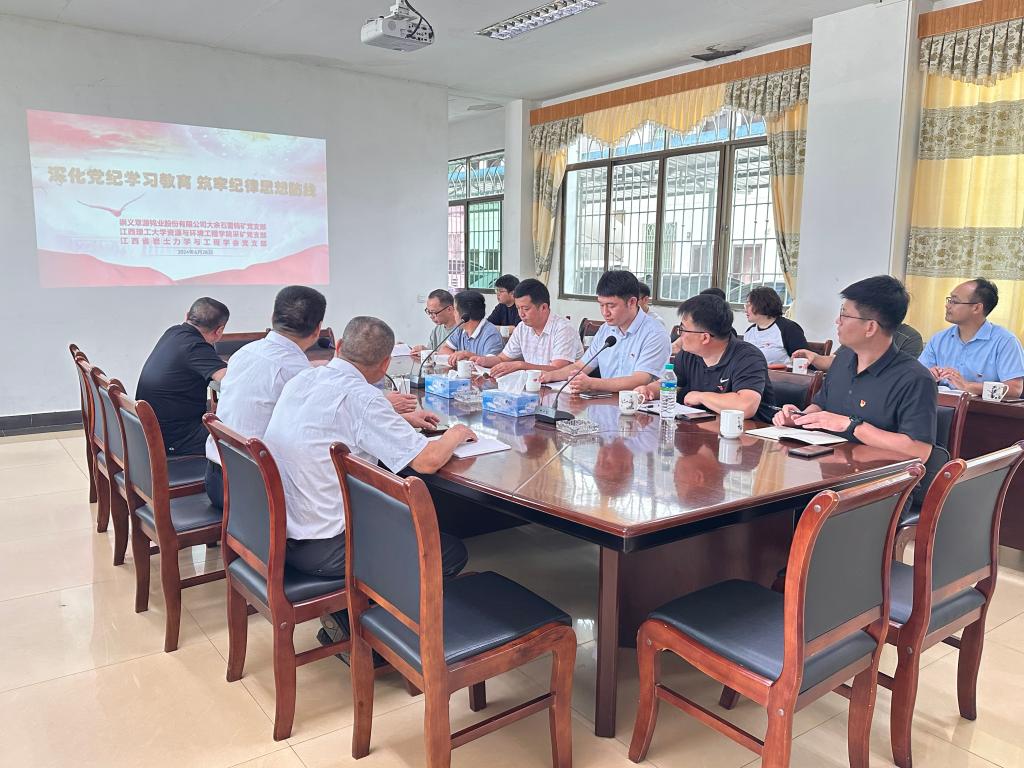 本网讯  6月28日,我院采矿党支部赴崇义章源钨业股份有限公司大余石雷钨矿大余石雷钨矿党支部、江西省岩土力学与工程学会党支部共同开展“1+1+1”支部共建活动进行了主题为“深化党纪学习教育筑牢纪律思想防线”主题党日学习。大余石雷钨矿党支部书记黄上贵矿长邱金铭,采矿党支部书记王石以及三个党支部党员参加了活动。