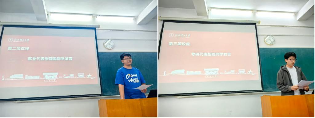紧接着,考研代表和就业代表分别上台分享各自的经验和心得。考研代表提到,考研是一条充满挑战的道路,但同时也是成长和进步的机会他建议同学们制定合理的学习计划,保持良好的心态,面对挑战坚持不懈就业代表则分享了找工作的经验他建议同学们通过老师或学校就业信息网了解就业形势和招聘信息,对公司进行初步了解,以充分准备面试强调积极心态的重要性,并提醒同学们在面试时注意言行举止。
