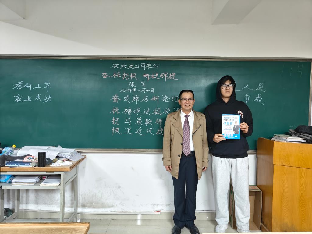 除了送上水果,陈飞还特地编写了一首诗歌,以“奋发踔厉研途行,楫橹逐浪程试清。扬鞭策马辉溢彩,帆里追风煌耀星”为句,激励考研学子们奋楫扬帆,勇攀学术高峰。