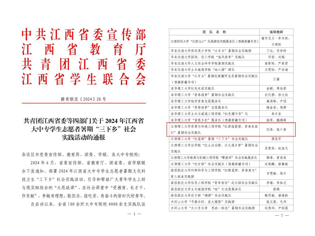 本网讯 近日,共青团江西省委等四部门发布《关于2024年江西省大中专学生志愿者暑期“三下乡”社会实践活动的通报》(赣青联发〔2024〕28 号),我院“红都摇篮情,青春长征行”暑期社会实践队荣获优秀团队奖。