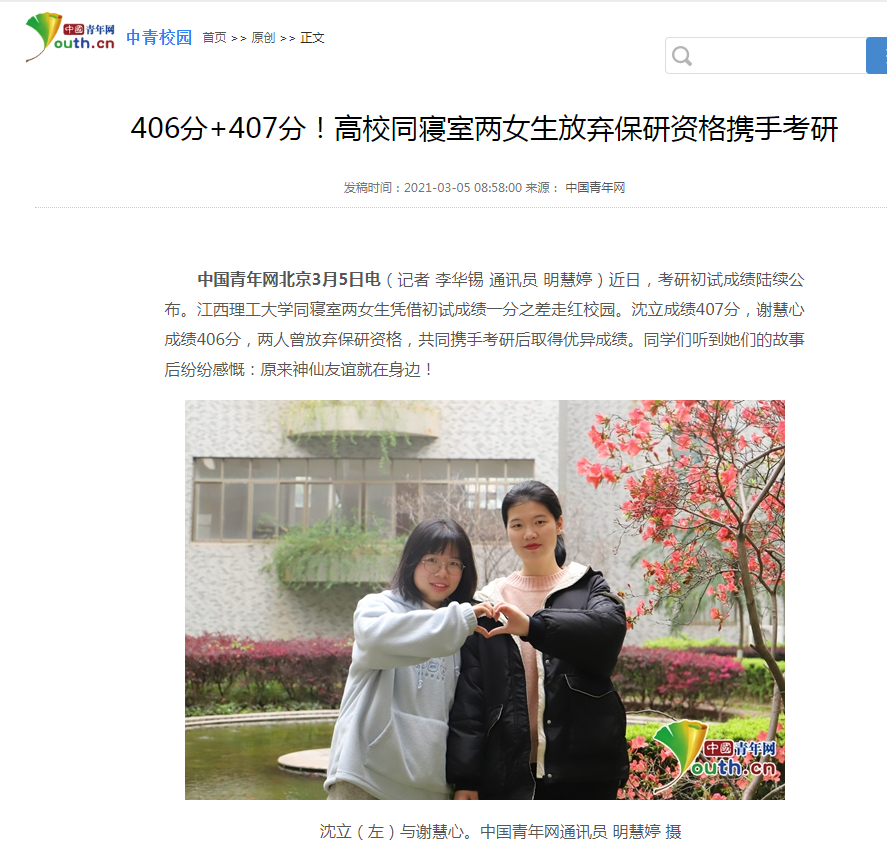 中国青年网北京3月5日电(记者 李华锡 通讯员 明慧婷)近日,考研初试成绩陆续公布。江西理工大学同寝室两女生凭借初试成绩一分之差走红校园。沈立成绩407分,谢慧心成绩406分,两人曾放弃保研资格,共同携手考研后取得优异成绩。同学们听到她们的故事后纷纷感慨:原来神仙友谊就在身边!