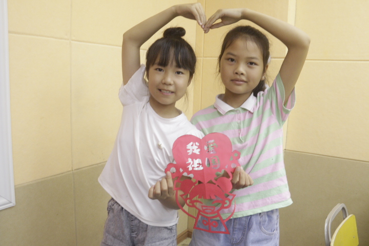课上实践队队员用以“科技强国”“我爱中国”为内容的红色卡纸教导学生手工实践。同时实践队队员详细教学如何剪纸,向学生讲解了卡纸内容的寓意。为保证安全,每四位学生由一位实践队队员在一旁看护教学。在实践队队员和学生的共同的努力下,以爱国为主题的剪纸终于成型。实践队队员们和学生们都露出了开心的笑容。