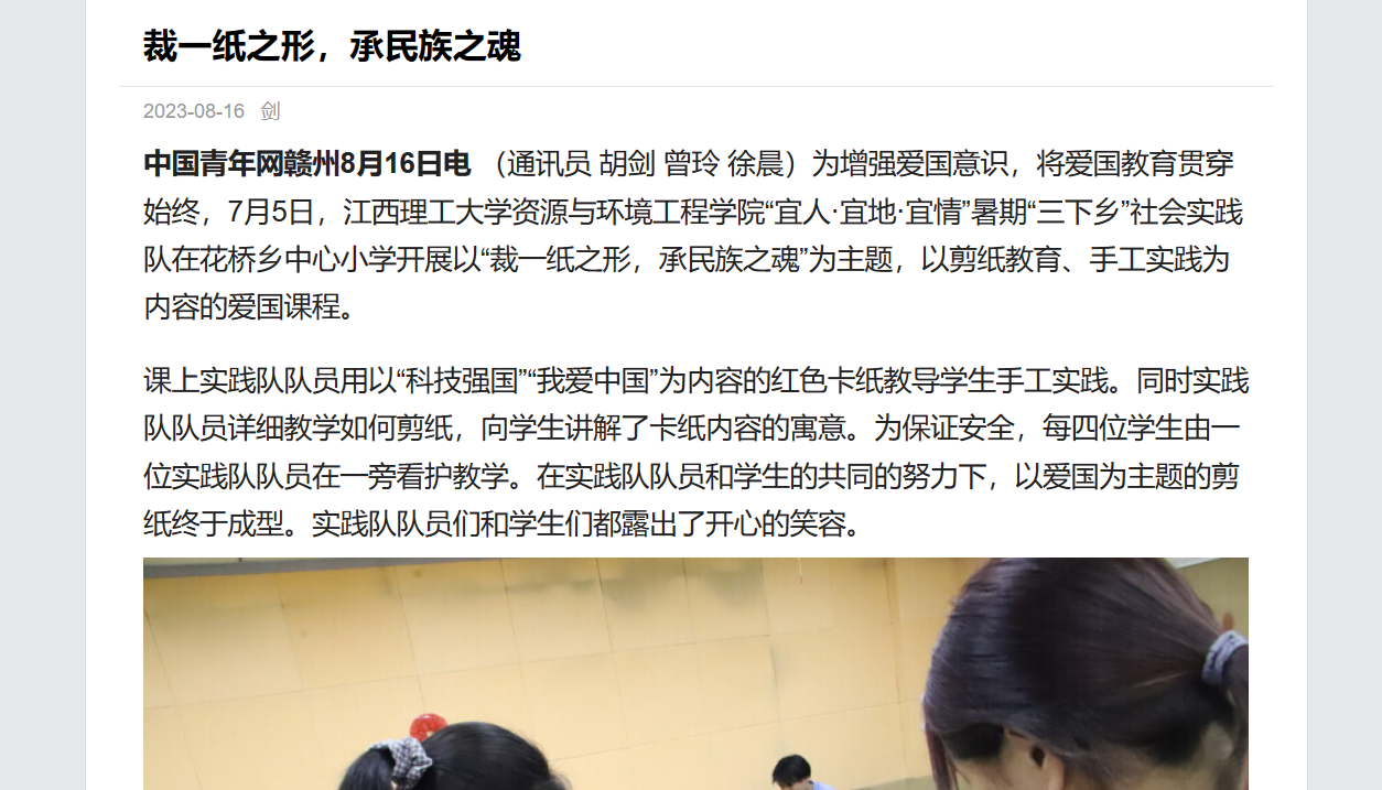 中国青年网赣州8月16日电 (通讯员 胡剑 曾玲 徐晨)为增强爱国意识,将爱国教育贯穿始终,7月5日,九州体育在线“宜人·宜地·宜情”暑期“三下乡”社会实践队在花桥乡中心小学开展以“裁一纸之形,承民族之魂”为主题,以剪纸教育、手工实践为内容的爱国课程。