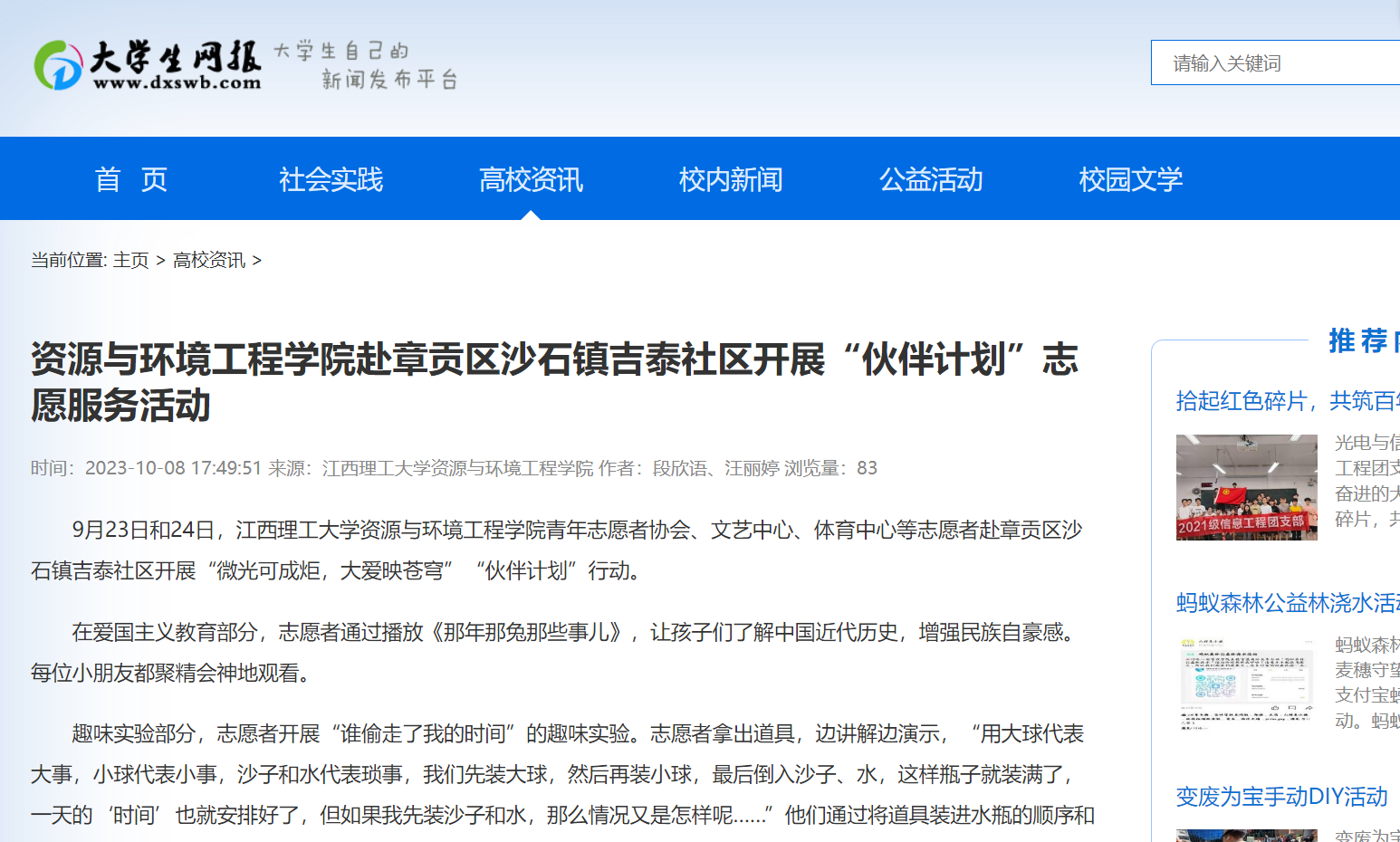 据学院青协负责人黄毅介绍,为深入开展习近平新时代中国特色社会主义思想主题教育和学习贯彻习近平总书记关于青年的重要讲话精神,增强青年的社会责任感与历史使命感,资源与环境工程学院在团章贡区委等单位的支持下开展“伙伴计划”行动,让大学生在社会实践中施展才华、实践成才,开展好新时代文明实践活动,促进社区儿童健康成长。