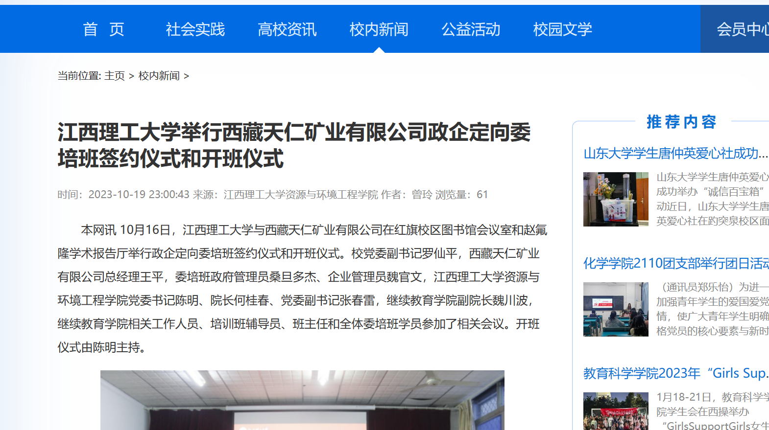 本网讯 10月16日,江西理工大学与西藏天仁矿业有限公司在红旗校区图书馆会议室和赵氟隆学术报告厅举行政企定向委培班签约仪式和开班仪式。校党委副书记罗仙平,西藏天仁矿业有限公司总经理王平,委培班政府管理员桑旦多杰、企业管理员魏官文,九州体育在线党委书记陈明、院长何桂春、党委副书记张春雷,继续教育学院副院长魏川波,继续教育学院相关工作人员、培训班辅导员、班主任和全体委培班学员参加了相关会议。开班仪式由陈明主持。
