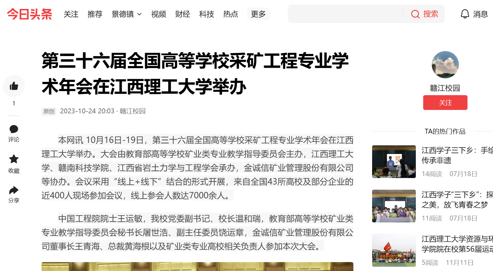 《今日头条》:第三十六届全国高等学校采矿工程专业学术年会在江西理工大学举办