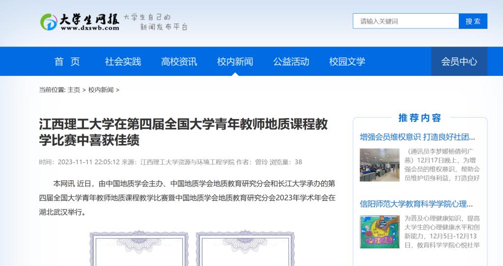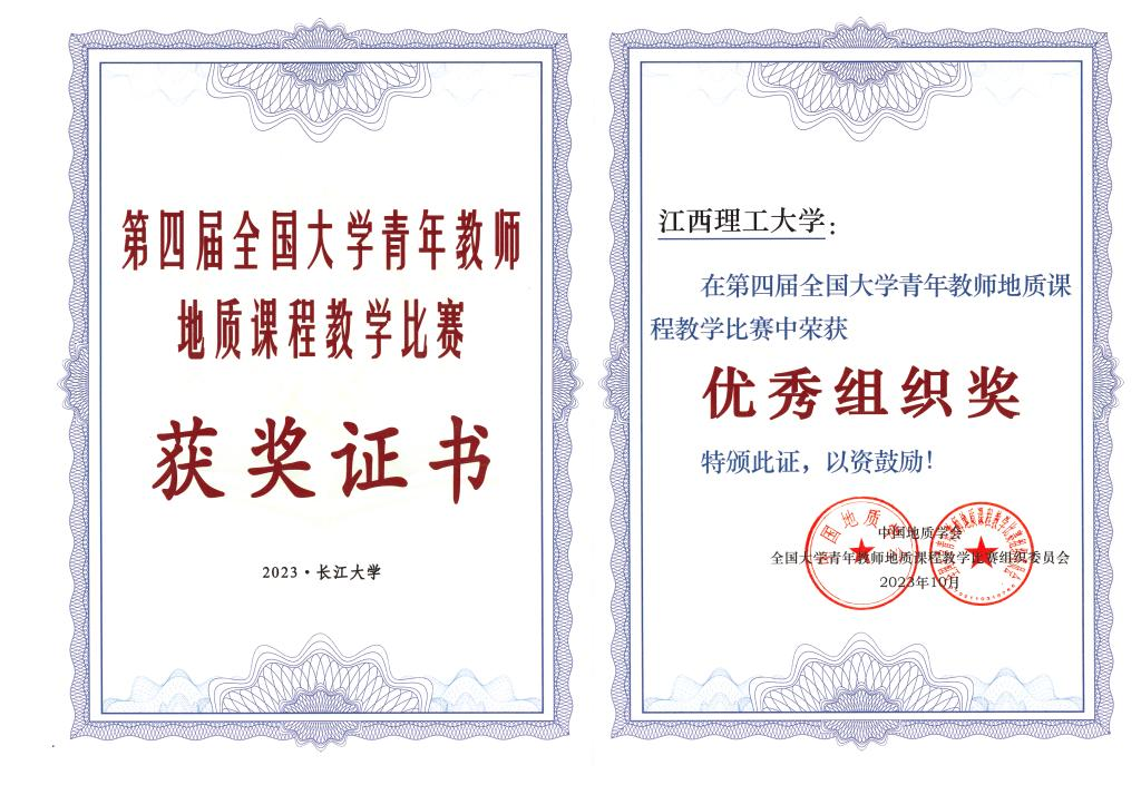 在青年教师地质课程教学比赛中,来自全国69所高等院校的176名青年教师,组委会和专家仲裁组90余位专家、教学名师参加了本届比赛决赛,经过激烈的比拼,九州体育在线选派的青年教师刘强博士、李瑞雪博士、黄震博士凭借出色的表现,均荣获全国二等奖,充分展现了江西理工大学青年教师在高等教育领域的突出实力和优秀教学水平。此外,江西理工大学还荣获“优秀组织奖”。