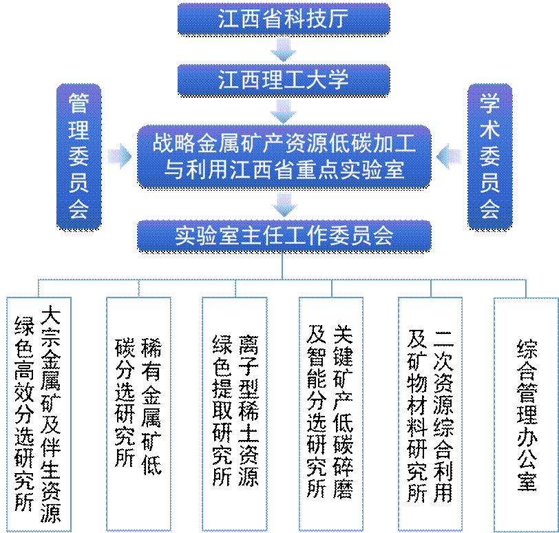 重点实验室在江西省科技厅和江西理工大学党政领导下,实行管理委员会具体领导下、学术委员会指导下的实验室主任负责制。管理层由管理委员会、学术委员会、主任工作委员会组成,下设综合管理办公室及5个研究所。