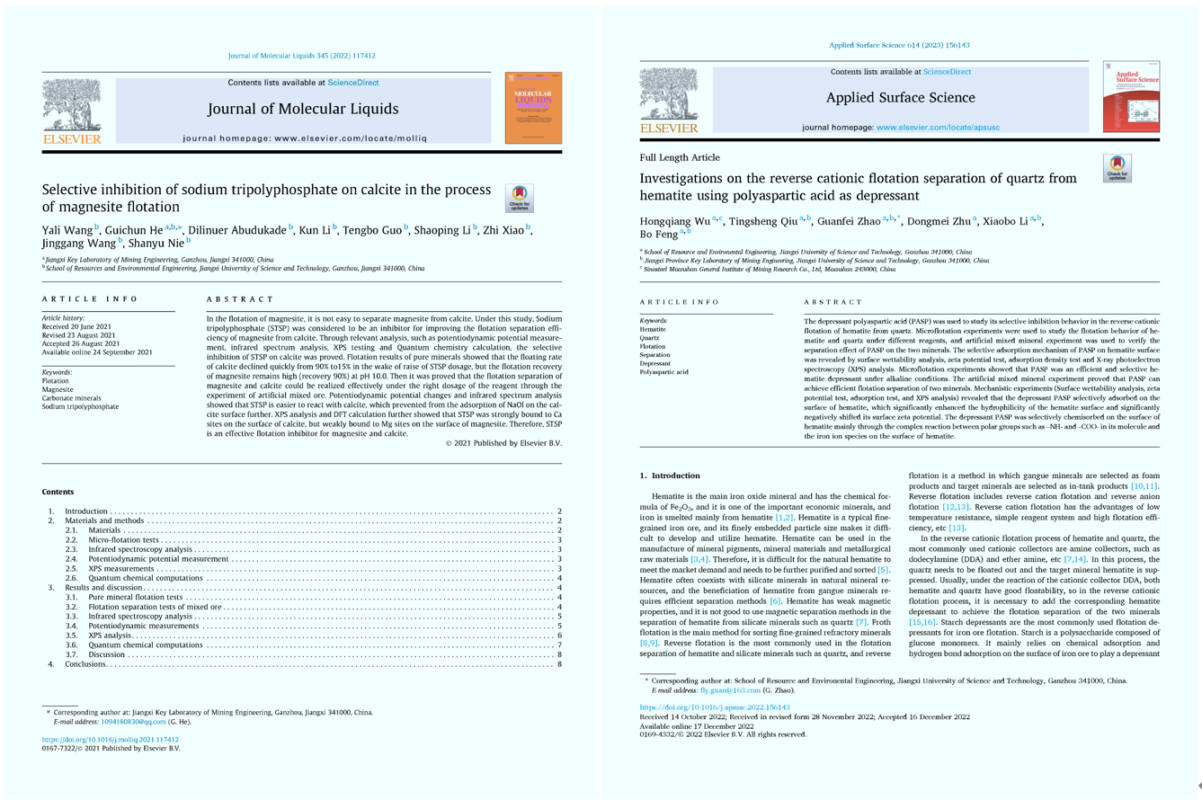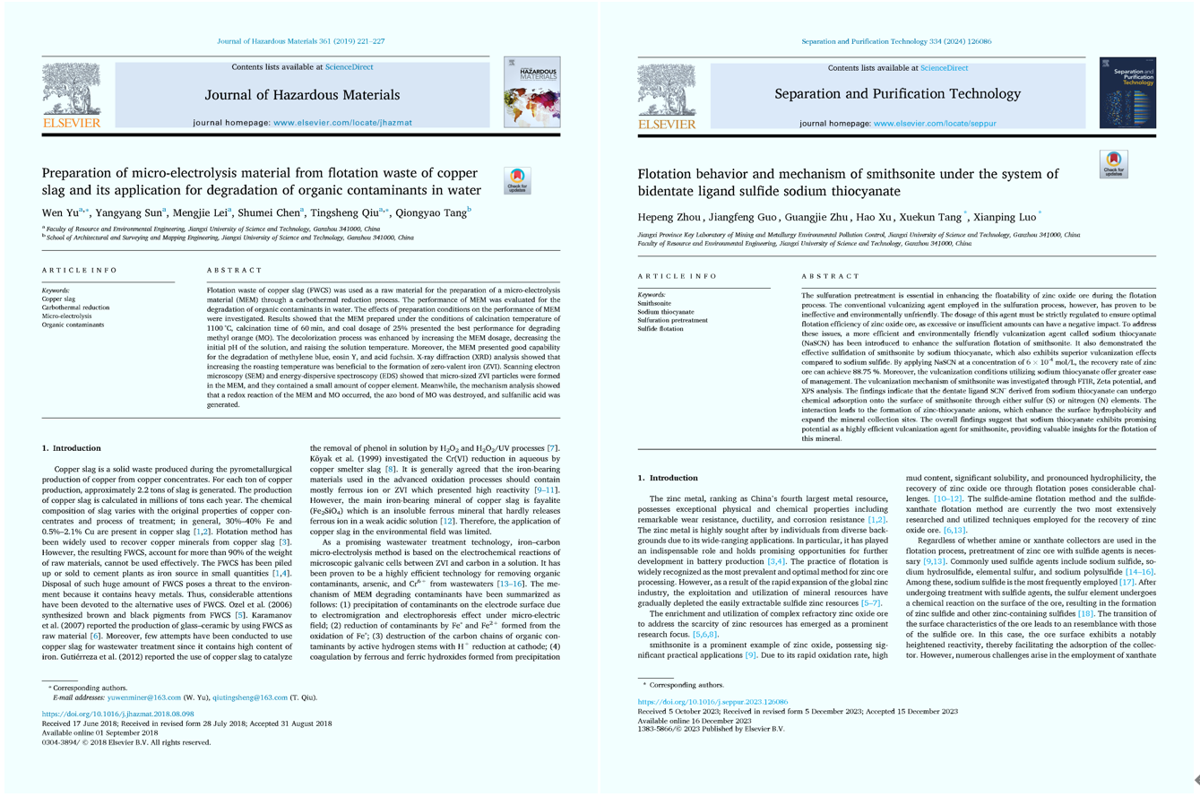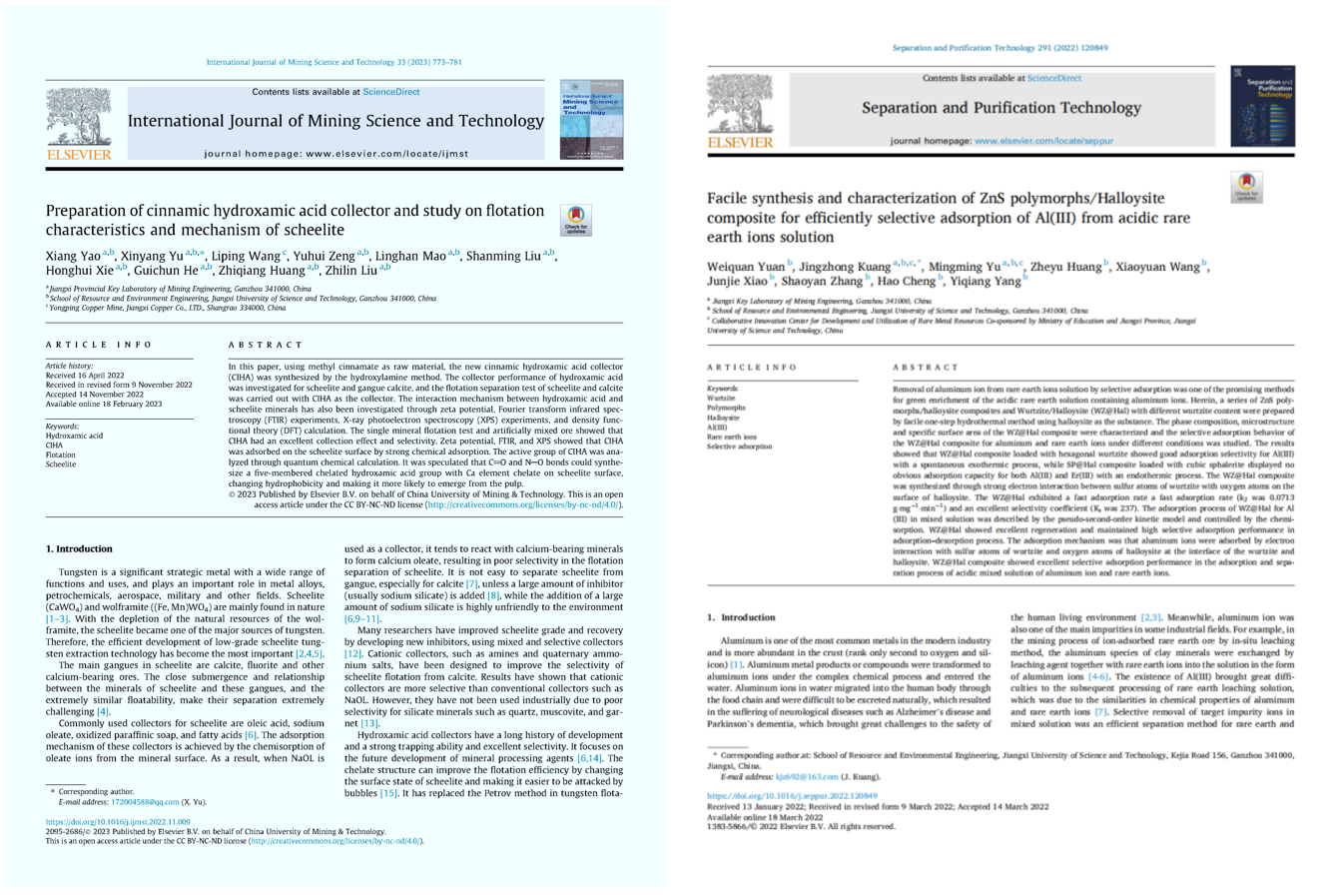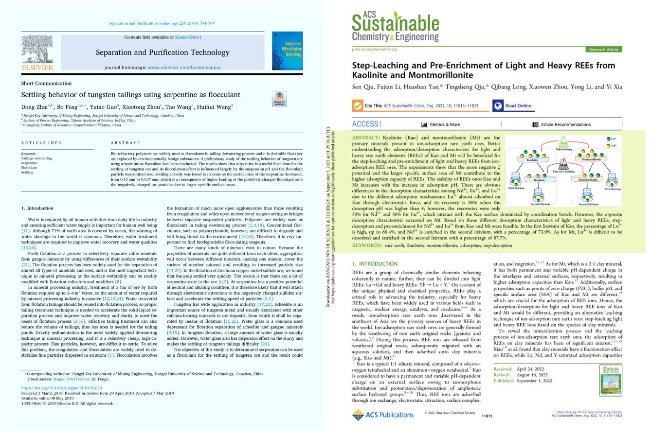 本实验室前期依托江西省矿业工程重点实验室,围绕铜、稀土、钨、钽、铌、锂等战略金属矿产碎磨、分选、矿物材料及二次资源利用等产业链,形成了一大批高水平的研究成果。近5年,共承担国家重点研发计划项目(2项)、国家自然科学基金、省重大科技专项等科研项目80余项,签订横向科技服务项目150余项,科研经费超8000万元,解决了复杂铜多金属硫化矿低碱分选及综合利用、极低品位钽铌矿山废弃资源整体清洁回收、复杂低品位含钨钼原料综合利用、离子型稀土绿色高效提取与生态修复、磨矿分级过程优化与控制等行业共性关键技术问题,取得系列“国际领先”成果,在江铜、江钨、中国稀土等龙头企业获得应用,累计新增效益超百亿元,提升了我国有色金属产业的核心竞争力,获得江西省自然科学一等奖、江西省科技进步一等奖等省部级奖励25项;授权国际/国家发明专利58件、发表高水平学术论文308篇;公开出版专著、教材21部。通过科研反哺教学教研与人才培养,先后获国家教学成果二等奖、江西省教学成果特等奖等国家/省部级教学成果奖励10项;指导学生获得中国国际“互联网+”创新创业大赛国家金奖、银奖等国家级竞赛奖励47项。