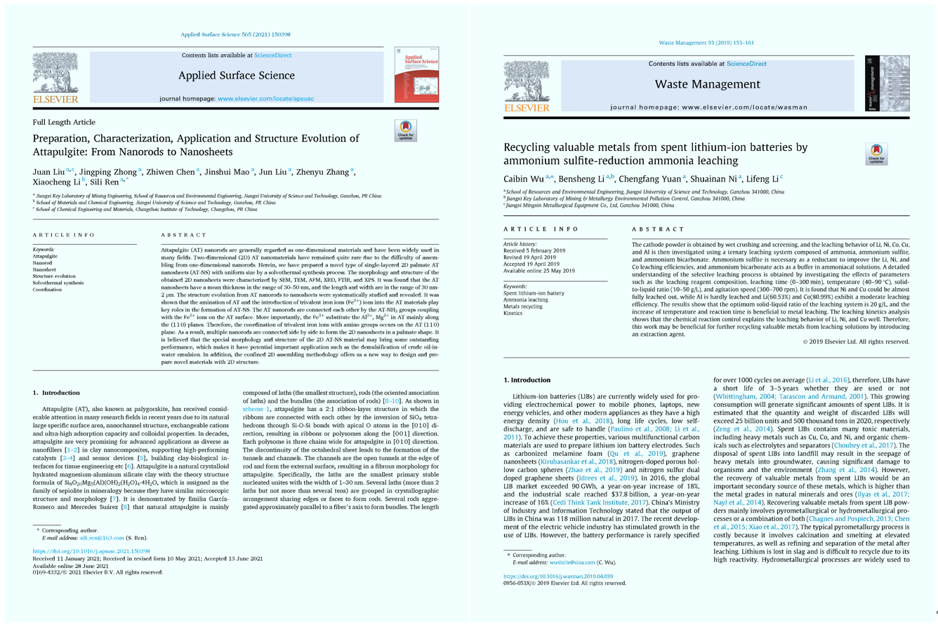 任嗣利 二次资源综合利用及矿物材料方向带头人,博士,二级教授,博士生导师,中国科学院“百人计划”A类人选,江西省首批“双千计划”创新领军人才,江西理工大学“清江学者”特聘教授,享受江西省政府特殊津贴,担任《Chinese Chemical Letters》青年编委、中国硅酸盐协会矿物材料分会理事。目前主要从事矿物工程与物质分离及环境科学与工程相关领域研究工作。近年来,主要承担中科院“百人计划”人才项目,国家自然科学基金项目(面上3项,青年1项),国家重点研发计划(子课题),江西省“双千计划”创新领军人才及江西省自然科学重点基金等项目。获甘肃省科技进步一等奖一项(主要骨干),以第一作者或通讯作者在CM, J. Hazard. Mater., Fuel, AIChE J.及Chem. Eng. J. 等国内外重要学术期刊上发表论文近百篇,其中SCI文章70多篇,授权中国发明专利8件,相关研究引起国内外学者关注。
