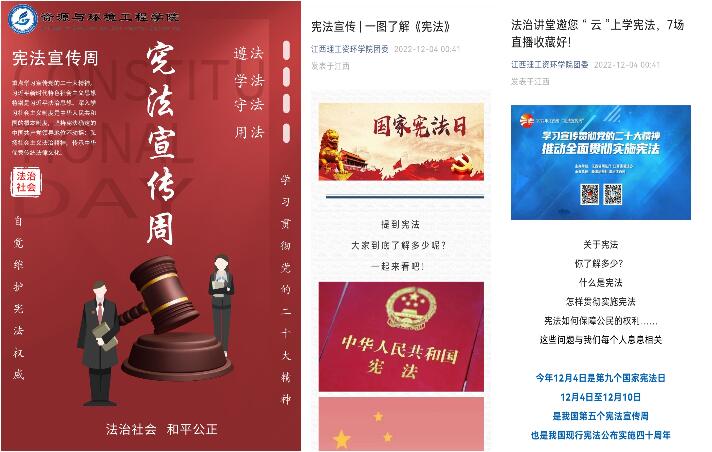 在学生寝室张贴了“宪法学习周”的宣传海报,在学院微信公众号发送学习收看“宪法宣传学习”直播的推文,将文明江西公众号的宪法宣传直播在班级群里转发呼吁积极参与,仅12月4日当天观看直播人数达900余人次,并充分利用了学院宣传平台进行宣传学习,取得了较好效果。通过公众号转发、张贴海报等形式引导师生学习宪法,在全院师生中掀起了学法、守法的热潮,增强了法治意识,形成了知法、懂法、守法的良好校园氛围。