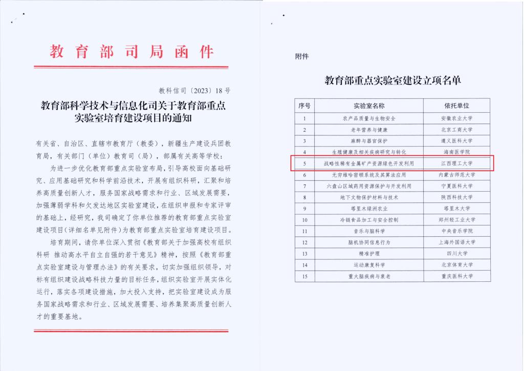 本网讯  近日,教育部科学技术与信息化司发布了《关于教育部重点实验室培育建设项目的通知》(教科信司〔2023〕18号),由我校我牵头申报的“战略性稀有金属矿产资源绿色开发利用教育部重点实验室”获批教育部重点培育实验室培育建设项目,全国仅15家单位获批组建培育。