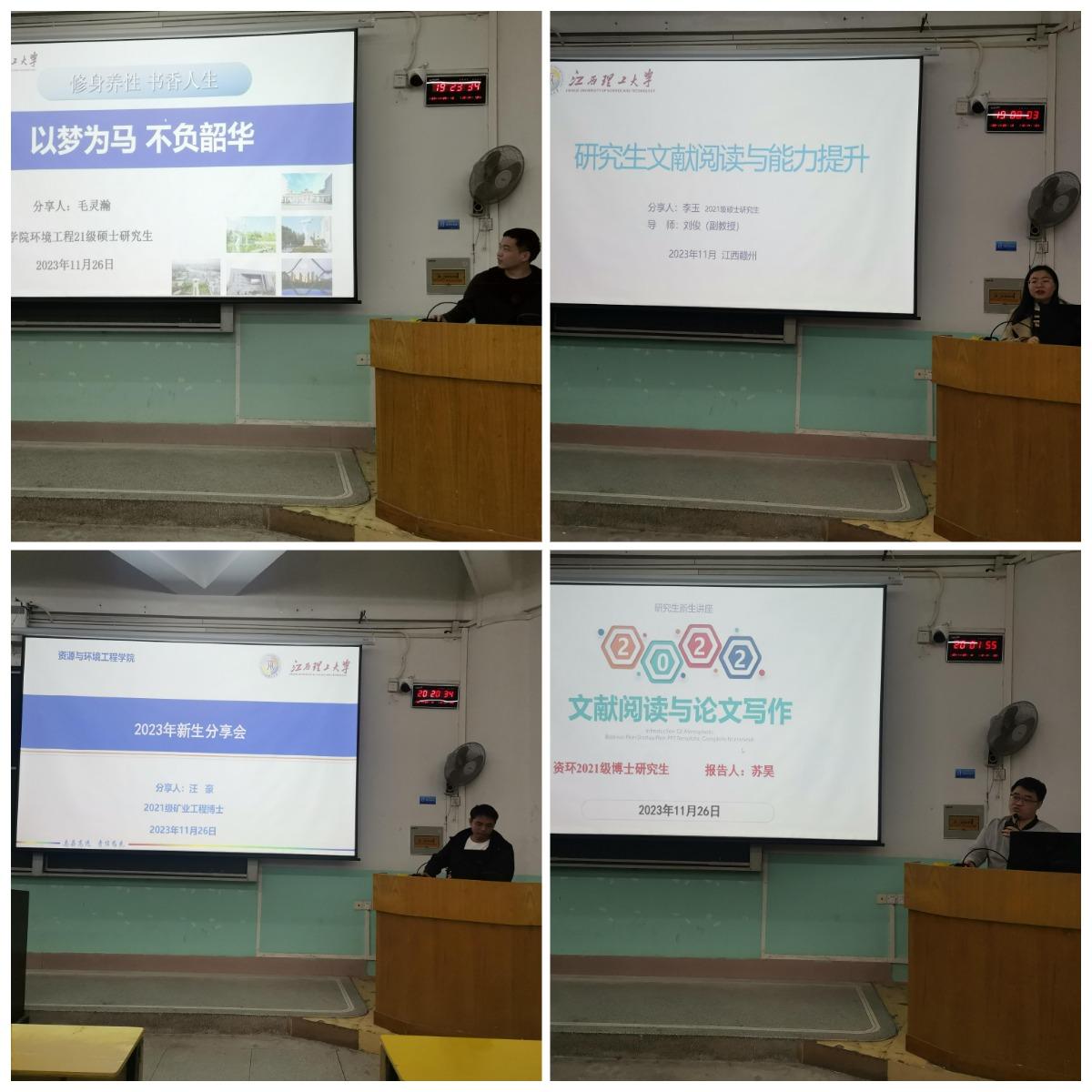 2021级矿加硕士研究生李文源和毛灵瀚主要讲解了论文的写作技巧,如何提升写作,并讲述了个人的研究生感悟;2022级土木硕士研究生李祖贵侧重于研究经验的分享,还为研一新生们提出了几点学习和生活的建议;、2021级矿加硕士研究生李玉从阅读方式、科研软件、交流访问等方向,讲解了论文总结段落的阅读技巧以及利用网上视频和软件资源的研学经验。