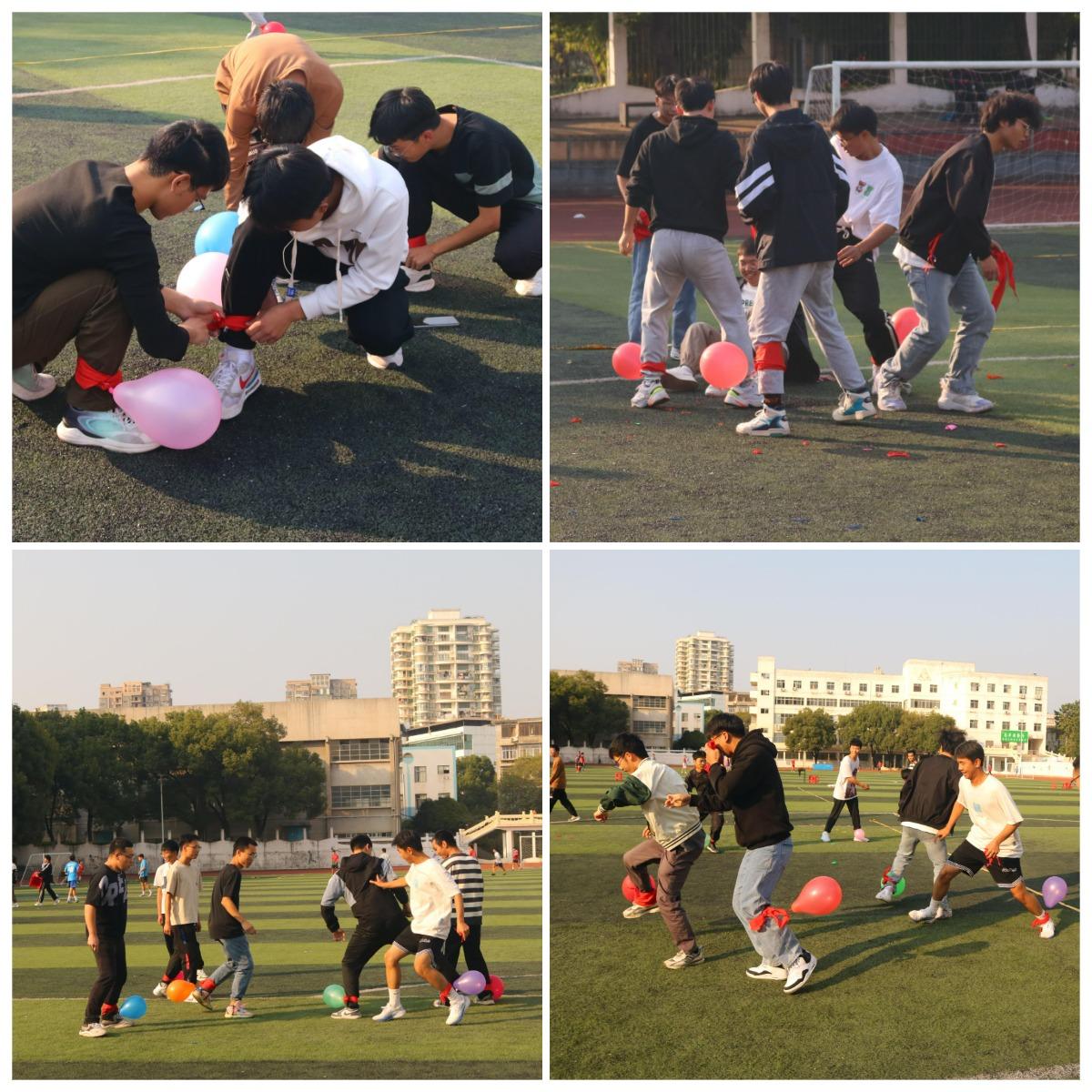 活动中,参赛者以寝室为单位分组,每人在脚上系上气球。活动规则是,保护自己寝室的所有气球,并尽可能击破其他气球,直至时间结束,按照每组气球剩余多少计分。随着比赛开始,每组成员迅速靠拢,小心翼翼的保护着自己的气球,目光环顾四周,脚下灵活移动,试图找到一个可以一举击败对手的机会,随着第一个气球的炸裂,操场上想起了此起彼伏的气球爆破声。