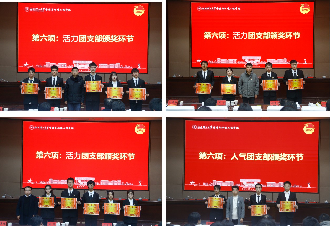 结合团支部日常考核情况和现场评委打分,最终,矿业233、生物232、环境232、矿业232、环境231、生物221、矿业224、地质221、地质222、矿业223、采矿212、采矿211、矿加211、地质212获得“活力团支部”称号;同时,经前期线上投票,环境231、环境222、采矿(中外)211获得“人气团支部”称号;