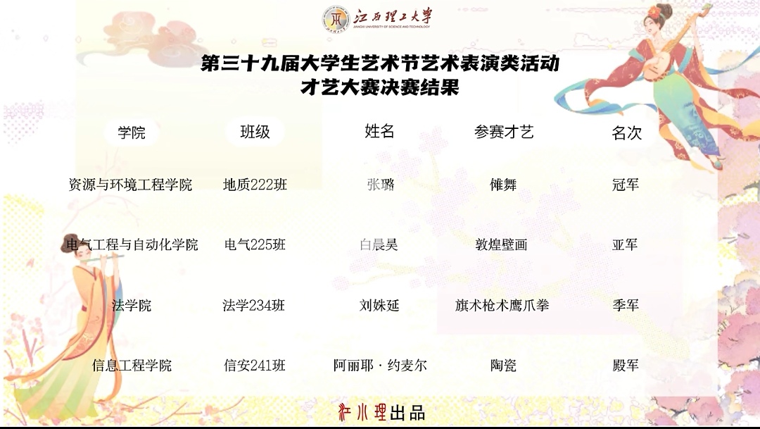 本次才艺大赛竞争激烈,分为四轮进行。在比赛过程中,张璐同学充分展示了她的多才多艺。第一轮,她带来了古筝演奏,指尖流淌出的音符,如潺潺溪流,灵动而美妙,瞬间将观众带入了一个古典雅致的音乐世界第二轮,张璐同学挥毫泼墨,展示书法技艺,笔锋婉转间,尽显汉字之美,让大家感受到了中国传统文化的深厚底蕴第三轮,张璐同学献上了民族舞与敦煌舞的组合表演她身着绚丽的舞衣,身姿轻盈,舞步灵动,将民族舞蹈的柔美与敦煌舞蹈的神秘完美融合,每一个动作都仿佛在诉说着古老的故事
