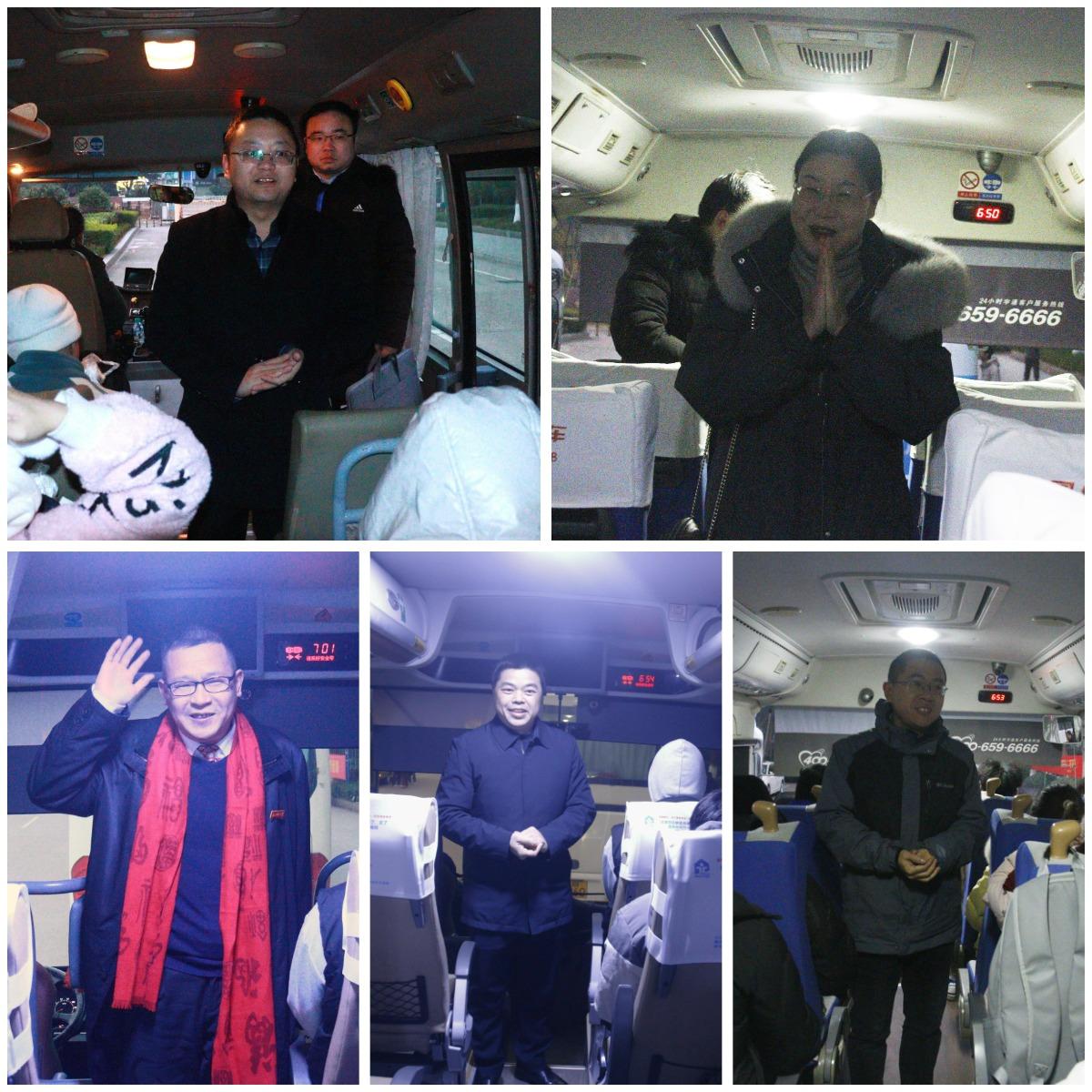 当考研学子们吃完早餐上车后,陈明、何桂春、陈飞、余新阳、董伟到考研巴车上提醒各学子再次检查准考证以及考试的必备用品,祝愿各考研学子旗开得胜、成功上岸,并希望同学们能沉着应考、冷静分析,不要因为考试过程受挫而放弃。