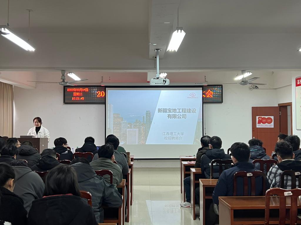 本网讯 2月14日,新疆宝地工程建设有限公司在黄金校区逸夫楼第二会议室举办招聘宣讲会公司人力资源部徐艳主讲,资源与环境工程学院相关教师和2019级采矿工程专业学生参加了宣讲会