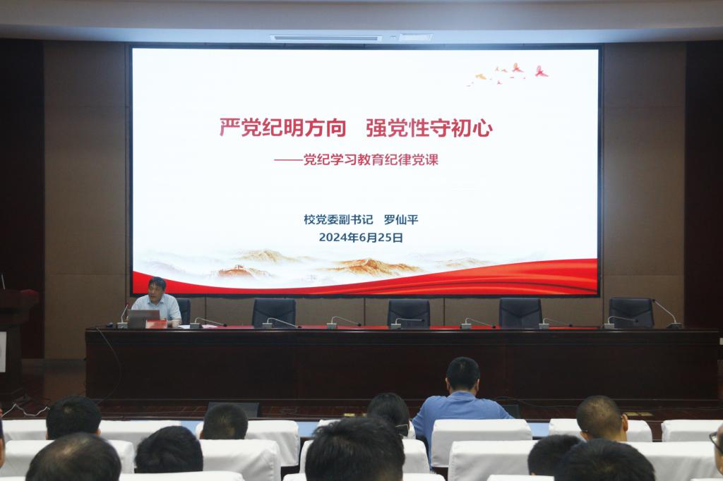 本网讯 为进一步树立纪律意识,切实维护和执行好党的纪律,6月25日,校党委副书记罗仙平在黄金校区逸夫楼学术报告厅主讲了题为《严党纪明方向 强党性守初心》的党纪学习教育纪律党课。资源与环境工程学院班子成员和全体教工党员参加了党课学习。党课由学院党委书记陈明主持。