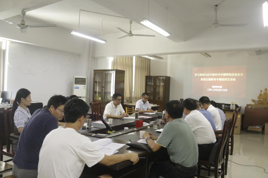 本网讯 9月19日,我院地质党支部在黄金校区逸夫楼B723会议室召开学习贯彻习近平新时代中国特色社会主义思想主题教育专题组织生活会。学院副院长陈飞和地质党支部全体党员参加会议。会议由地质党支部书记郭小飞主持。
