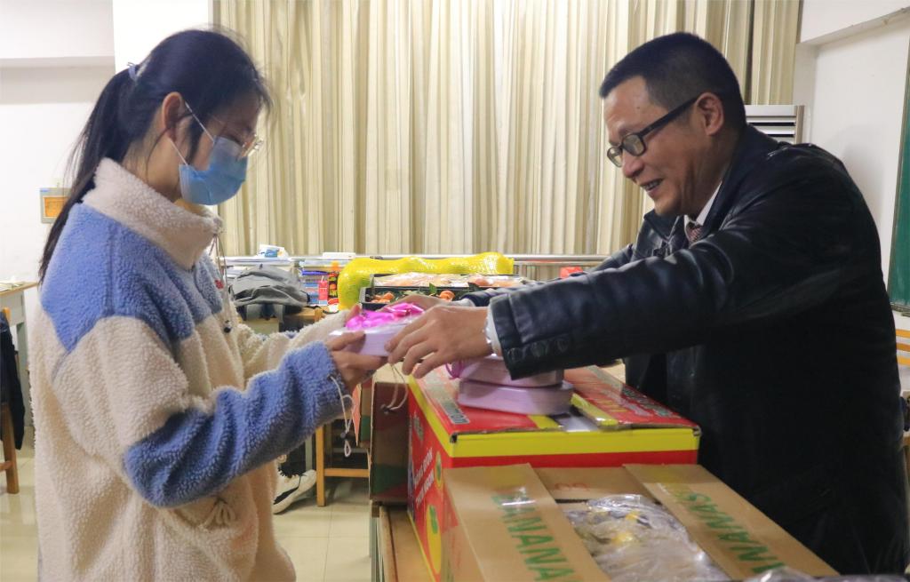 “早就听学长学姐说过‘大飞哥’每年都会给学子送祝福,今年也特别期待,自己买水果都是一小袋一小袋的买,今天实现了水果自由,‘大飞哥’的鼓励让我备受鼓舞,在寒冷的冬天里感受到一股暖流。”地质192班刘文斌笑着说。