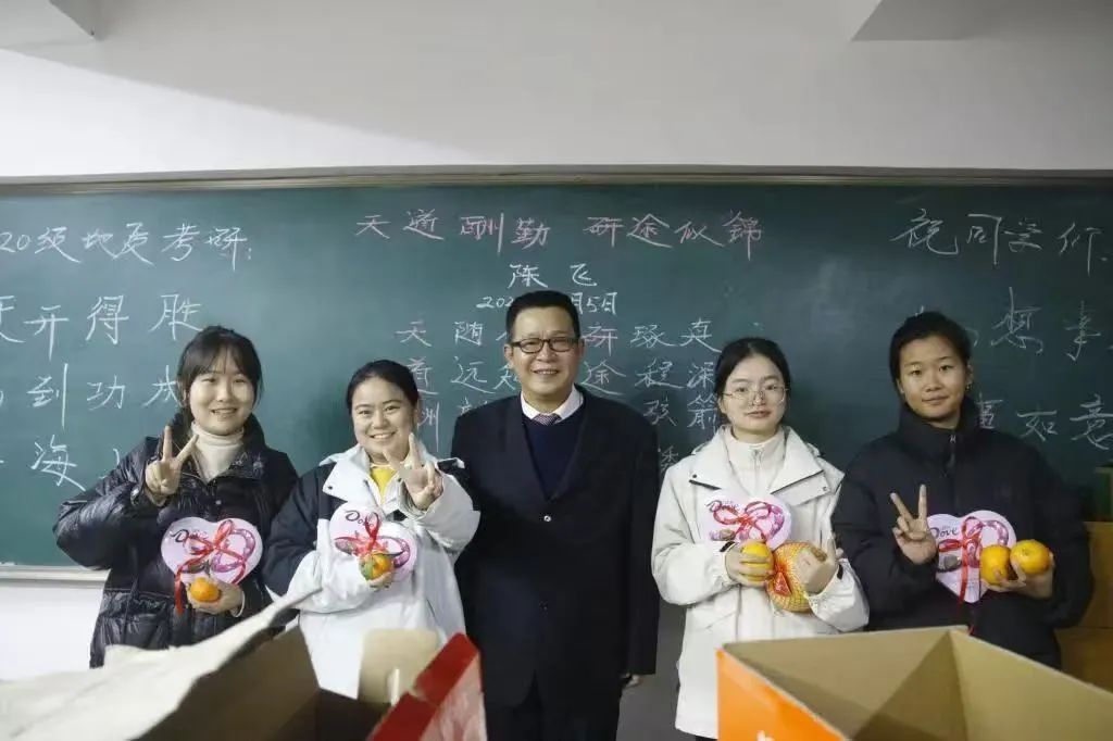 “脐”开得胜、“柿柿”如意、“苹苹”安安、 “蕉”上好运……陈飞每年自费购买十几箱脐橙、柚子、苹果、柿子、香蕉等水果和巧克力,并赋予吉祥的寓意和美好的祝福。15年来,他累计支出3万余元,为学子送上了满满的关爱。所带班级年年都评为学校“学风先进班集体”,考研率也都一直保持在40%以上。
