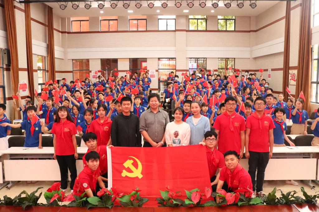 活动开始,大家一同观看了我校献礼建党百年宣传片《青春为祖国歌唱》,小朋友们为红色宣讲团成员们戴上红领巾。