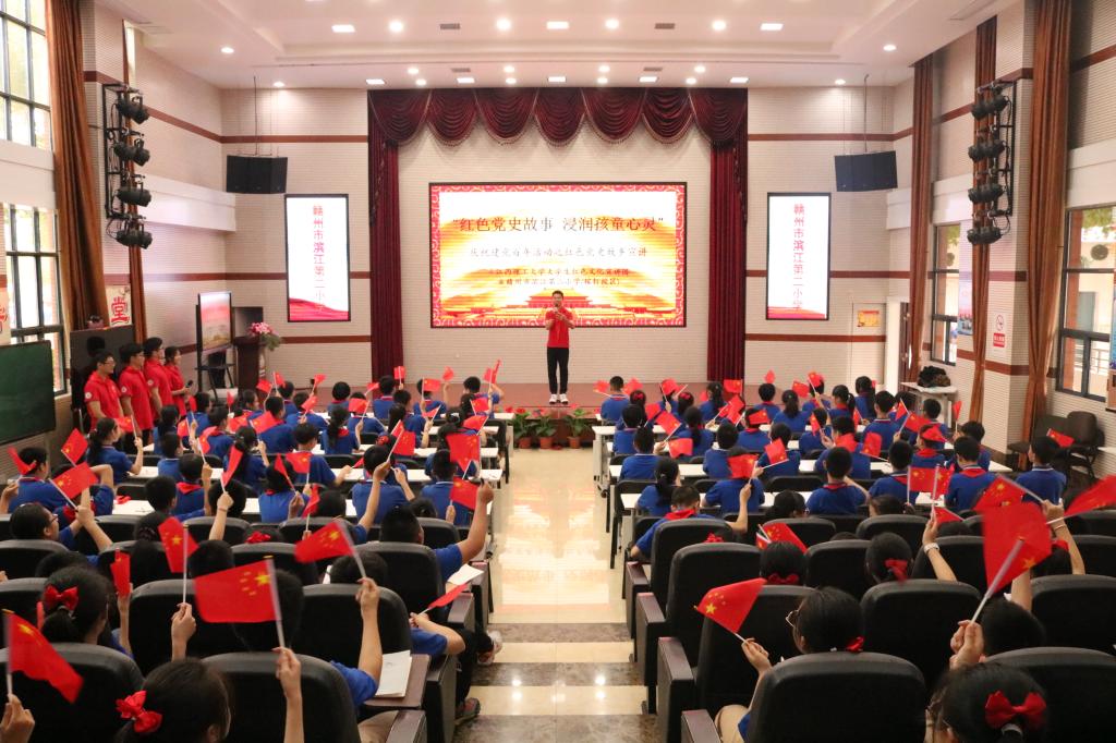 本网讯 5月18日下午,我院大学生红色文化宣讲团走进赣州市滨江第二小学(稼轩路校区),为小朋友们宣讲党史红色故事。学工办副主任兼团委副书记刘浩、辅导员张小普、红色宣讲团成员和滨江第二小学的部分老师以及六年级学生参加了此次活动。活动由红色宣讲团成员陈雨歆主持。