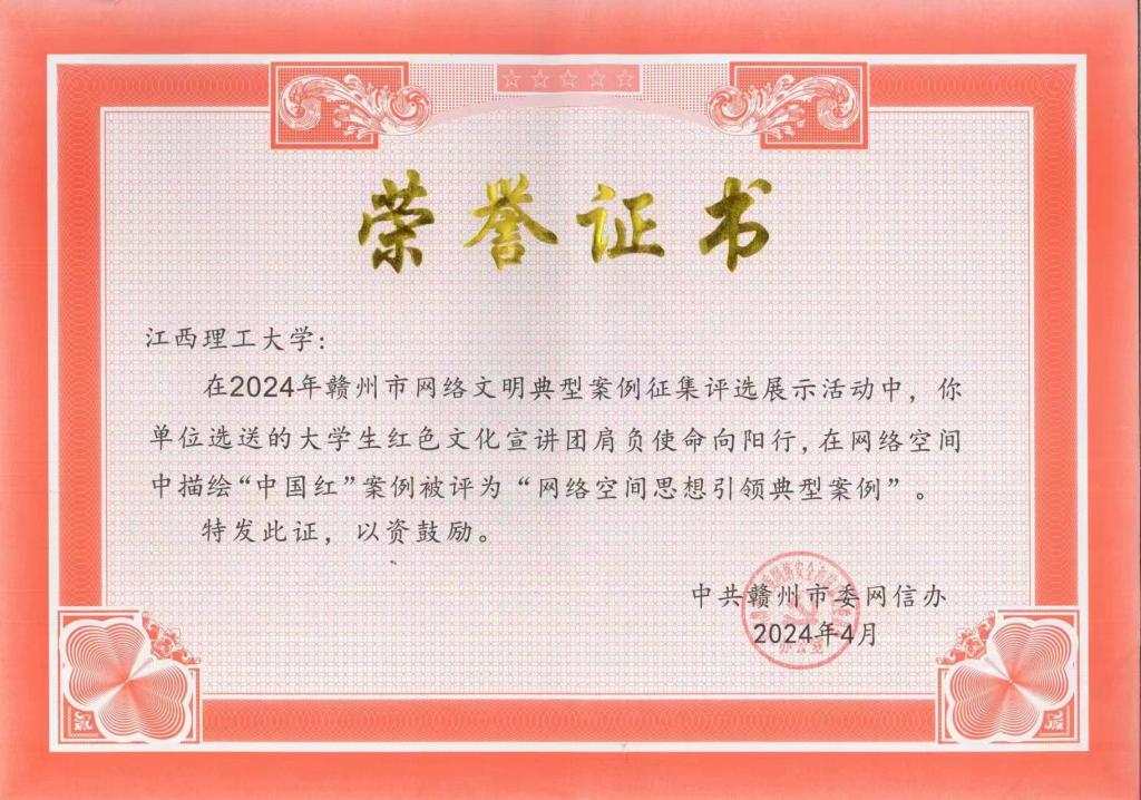 本网讯 4月25日,赣州市2024年网络盛典暨网络文明宣传周活动启动仪式盛大开启,该活动由中共赣州市委网信办主办,赣州市融媒体中心、赣州文化传媒集体承办,活动在赣南红客户端、赣南日报视频号、赣州广播电视台视频号等平台同步直播。经全市各单位推荐,专家审核、网络公示等程序,我院大学生红色文化宣讲团获评赣州市网络思想引领典型案例。